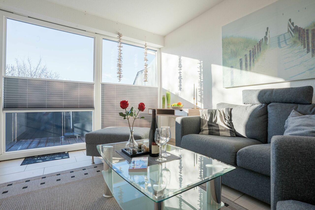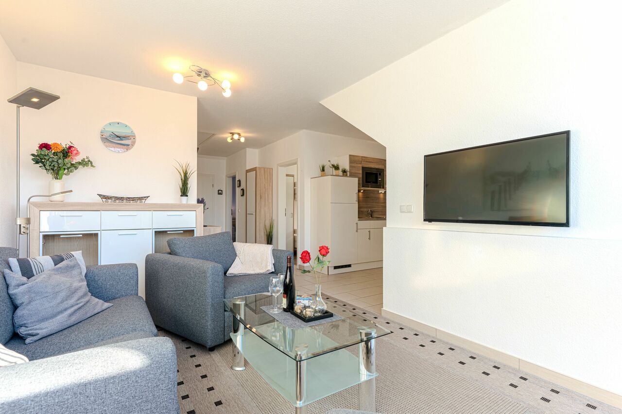 Der großzügige Wohnbereich ist lichtdurchflutet und bietet viel Raum zum Entspannen. Die offene Küchenecke ist vollständig ausgestattet und ideal für Gäste, die auch im Urlaub gern selbst kochen.