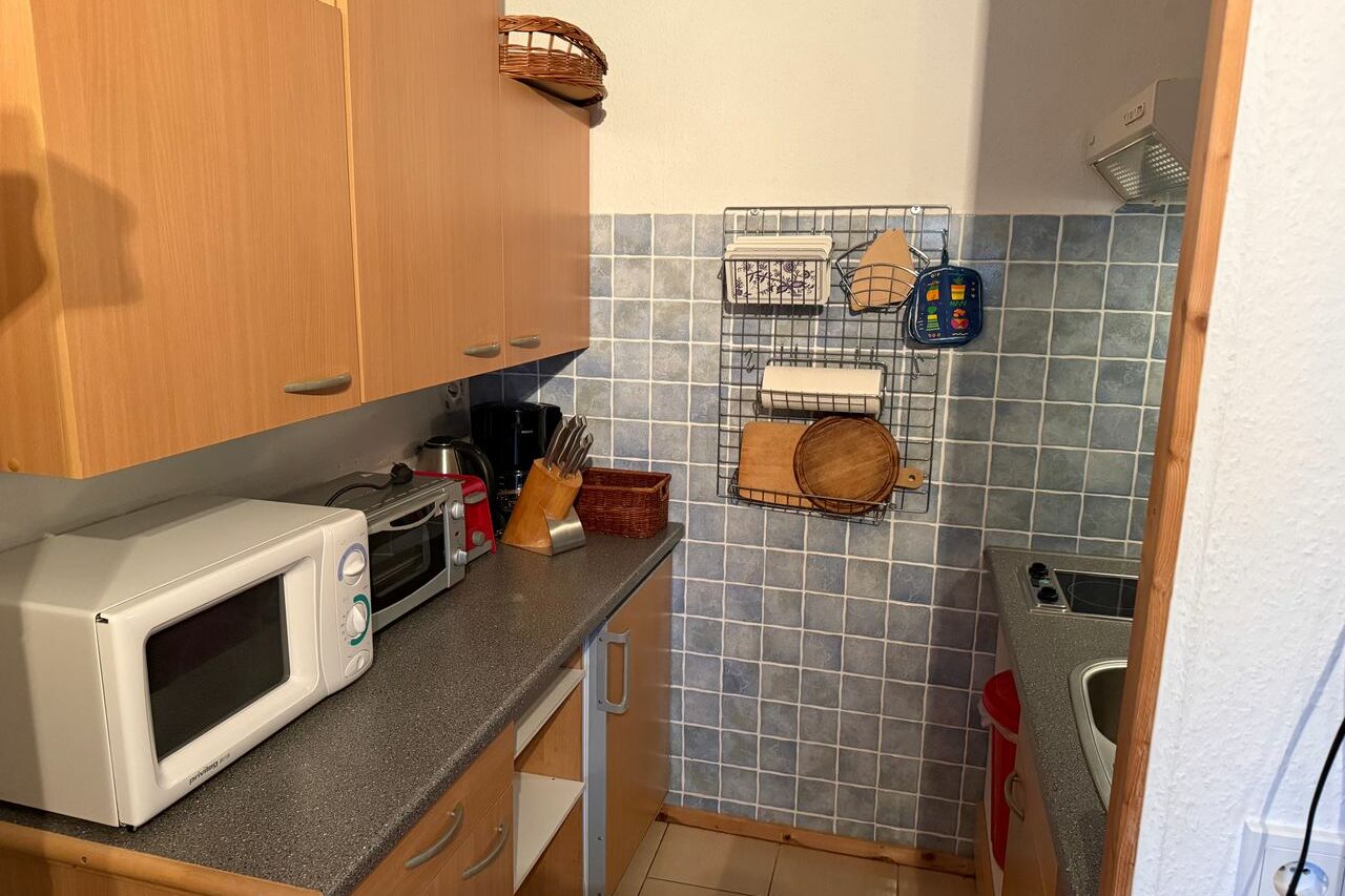 Die offene Küche ist komplett ausgestattet und bietet somit alle Möglichkeiten zur Selbstversorgung. An kälteren Tagen sorgt ein Kachelofen für Behaglichkeit. Das Badezimmer ist mit einer Dusche und einem WC ausgestattet. Es gibt zwei Schlafzimmer, eines davon verfügt über ein Etagenbett. Das Wohnzimmer ist gemütlich eingerichtet und verfügt über einen Sat-TV.