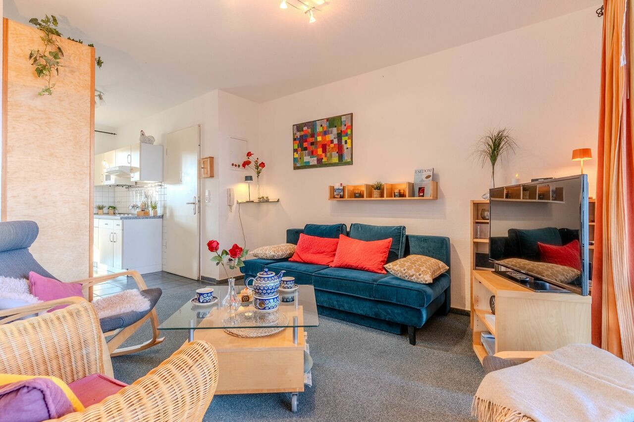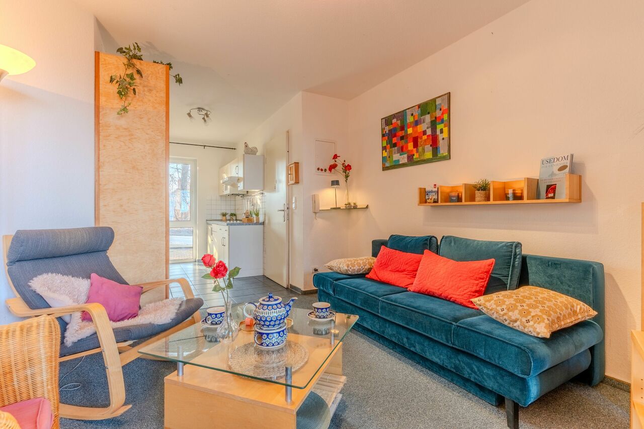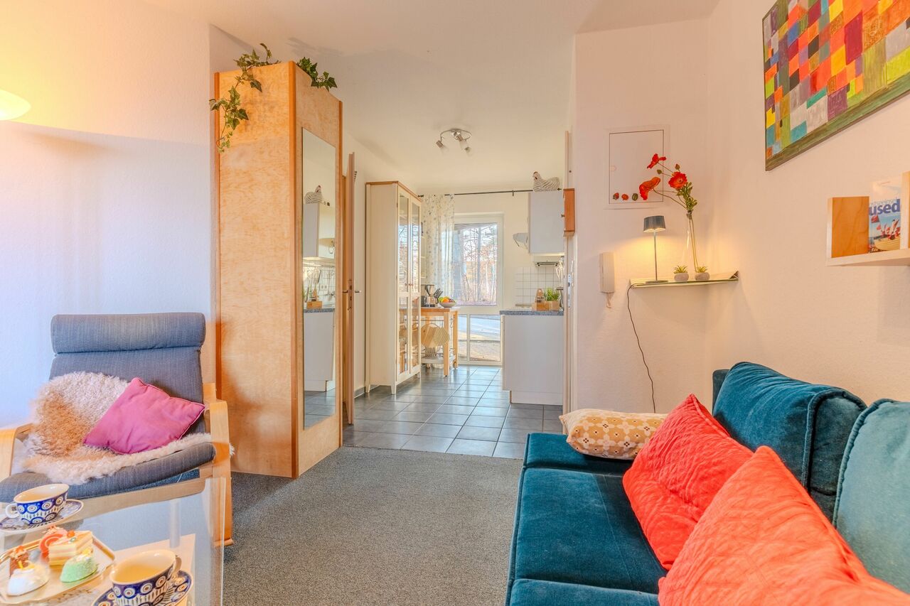 Dieses Appartement befindet sich im Erdgeschoss innerhalb der Ferienanlage 'Seeblick'. Es bietet einen Ausblick auf die Ostsee und die Seebrücke. Das Appartement verfügt über ein Badezimmer mit Dusche und WC, einen Wohnraum mit Fernseher, Radio und offener Küche, die mit einem Toaster, einer Kaffeemaschine und einem Kühlschrank ausgestattet ist. Von der möblierten Terrasse aus hat man ebenfalls einen Blick auf das Meer und die Seebrücke. Des Weiteren gibt es ein Schlafzimmer mit einem Doppelbett. Das Appartement ist zentralbeheizt und bietet Platz für max.3 Personen, da sich im Wohnraum eine Schlafcouch befindet. Die Buchung beinhaltet auch ein Set aus Bettwäsche und Handtüchern.